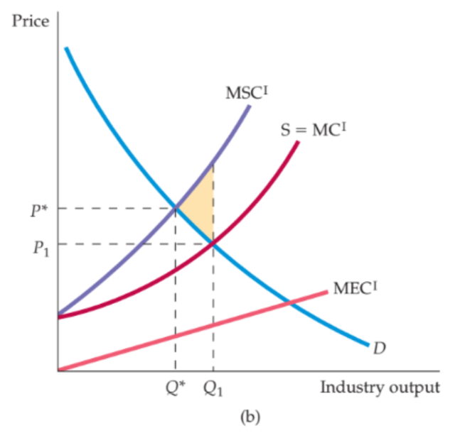 Biaya eksternal tersebut ditunjukkan oleh kurva MECᴵ (Marginal External Cost), dan ketika biaya tersebut dijumlahkan dengan biaya privat, terbentuk kurva MSCᴵ (Marginal Social Cost) yang menggambarkan total biaya sosial sebenarnya. Keseimbangan sosial yang efisien seharusnya terjadi pada titik (P*, Q*), yaitu perpotongan antara D dan MSCᴵ, di mana seluruh biaya sosial telah diinternalisasi. Perbedaan antara output pasar (Q₁) dan output efisien sosial (Q*) menunjukkan adanya produksi berlebih (overproduction) akibat eksternalitas negatif. Area berwarna pada grafik mencerminkan deadweight loss yang muncul karena pasar menghasilkan output melebihi tingkat efisien. Untuk mengoreksi kegagalan pasar ini, pemerintah perlu menetapkan kebijakan yang bisa mendorong harga naik ke (P*) untuk demerit goods ini sehingga kuantitasnya bisa dikurangi.