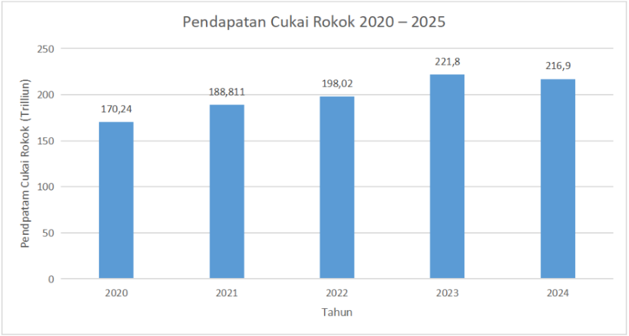 Pemerintah menegaskan kebijakan kenaikan cukai rokok yang mulai berlaku pada 1 Januari 2020 dengan peningkatan sebesar 23% (Setkab, 2020) dan dalam tahun-tahun berikutnya tarif tersebut terus meningkat dengan rata-rata sebesar 11%. Hal ini dapat dilihat melalui data yang dirilis oleh Direktorat Jenderal Bea dan Cukai (DJBC) pada 2021, DJBC menerima pendapatan melalui cukai rokok sebesar 188,881 Triliun Rupiah dan pada 2024 tercatat menerima pendapatan melalui cukai rokok sebesar 216,9 Triliun Rupiah atau 3 kali anggaran makan bergizi gratis (MBG) tahun 2025.