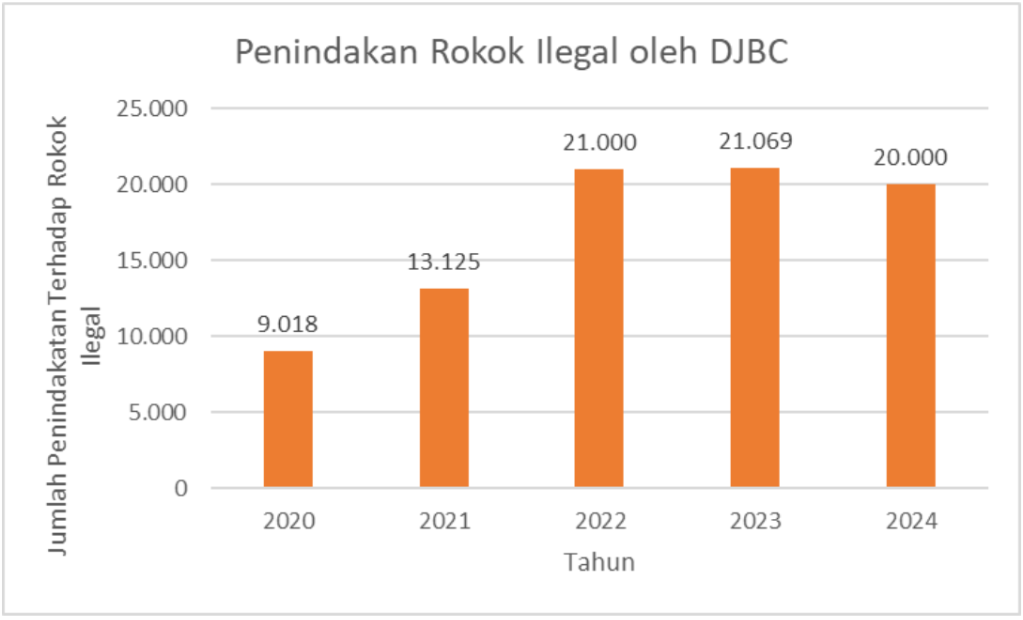 Data pada grafik menunjukkan bahwa tren peredaran rokok ilegal di Indonesia semakin mengkhawatirkan meskipun upaya penindakan oleh Direktorat Jenderal Bea dan Cukai (DJBC) terus dilakukan secara intensif. Jumlah penindakan meningkat tajam dari 9.018 kasus pada tahun 2020 menjadi 13.125 kasus pada 2021, dan melonjak signifikan menjadi 21.000 kasus pada 2022. Angka tersebut bahkan mencapai puncaknya pada 2023 dengan 21.069 penindakan sebelum sedikit menurun menjadi 20.000 kasus pada 2024. Kenaikan yang konsisten dalam jumlah penindakan ini justru menunjukkan bahwa peredaran rokok ilegal masih marak dan sulit dikendalikan, menandakan adanya potensi kebocoran penerimaan negara serta tantangan serius bagi efektivitas kebijakan cukai hasil tembakau.