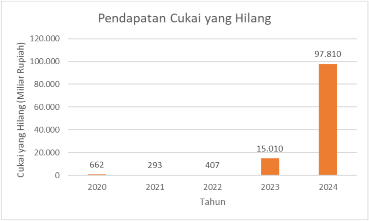 Data tersebut menunjukkan bahwa potensi pendapatan cukai yang hilang akibat peredaran rokok ilegal mengalami lonjakan tajam dalam lima tahun terakhir, menandakan semakin seriusnya ancaman terhadap penerimaan negara. Pada tahun 2020, potensi kehilangan cukai tercatat sebesar Rp662 miliar, kemudian justru menurun menjadi Rp293 miliar pada 2021 dan sedikit naik menjadi Rp407 miliar pada 2022. Namun, pada 2023 terjadi lonjakan signifikan hingga mencapai Rp15,01 triliun, dan pada 2024 jumlahnya kembali melonjak drastis menjadi Rp97,81 triliun. Peningkatan yang sangat tajam ini menggambarkan bahwa meskipun intensitas penindakan terhadap rokok ilegal meningkat, peredarannya tetap meluas dan berdampak besar terhadap potensi penerimaan cukai negara, sehingga menuntut langkah pengawasan dan penegakan hukum yang lebih efektif serta strategi penyesuaian kebijakan cukai yang lebih komprehensif.